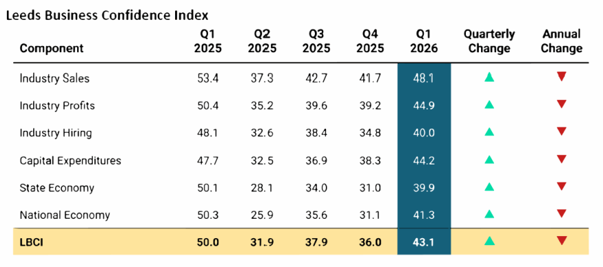 Ahead of the first quarter of 2026, the index rose to 43.1 from 36 in the fourth quarter of 2025. A score of 50 is considered neutral, leaving the index in negative territory. The largest gains were recorded in national and state economic outlooks, while sales and profits posted the highest index levels overall.