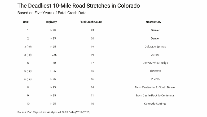 The study, based on National Highway Traffic Safety Administration data from 2019 to 2023, examined fatal crashes across Colorado using a rolling 10-mile window to identify the highway segments with the highest number of deadly collisions.