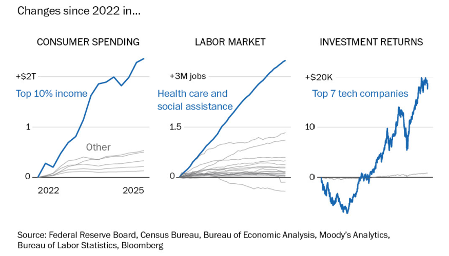 But economists caution that growth is increasingly concentrated. The result is a steady but fragile economy, built on a series of narrowing pillars.