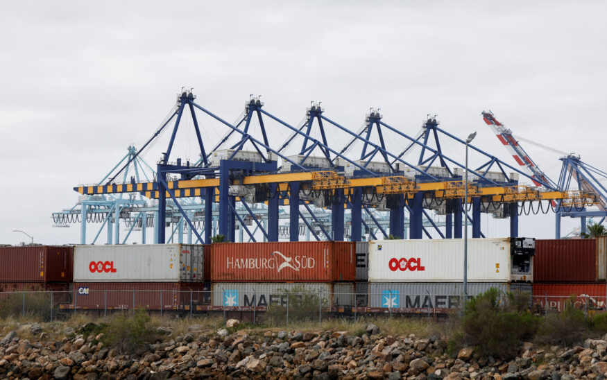 Shipping containers wait to be transported along a railroad at the port of Los Angeles in Long Beach, California, U.S., March 10, 2026. REUTERS/Caroline Brehman/File Photo
