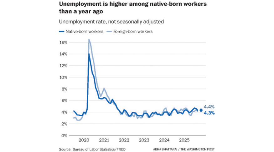 Unemployment is higher among native-born workers today than a year ago. Courtesy of The Washington Post.
