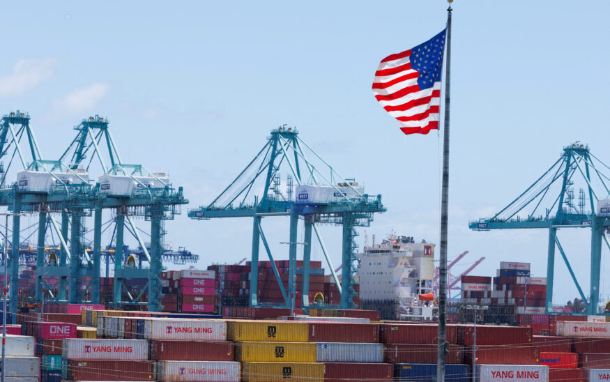 An American flag flutters over a ship and shipping containers at the Port of Los Angeles, in San Pedro California, U.S., May 13, 2025. REUTERS/Mike Blake/File Photo